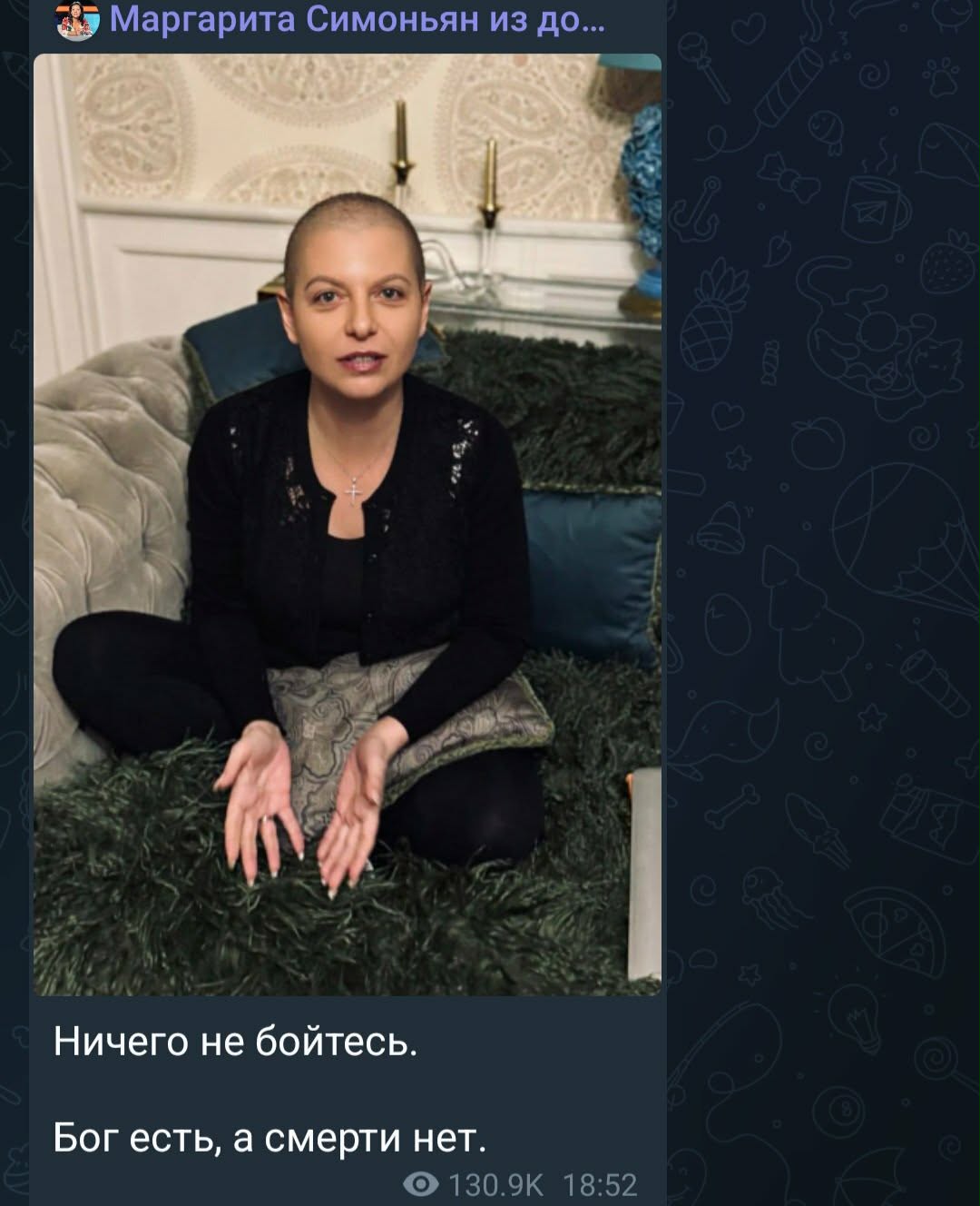 К примеру, супруга блогера Рустама Солнцева усомнилась в том, что Симоньян действительно проходит курс химиотерапии. Тем временем в комментариях под снимком появилось множество слов поддержки. Пользователи желали Маргарите здоровья, призывали беречь себя, писали, что переживают за нее, желали сил и веры, а также отмечали, что молятся за ее выздоровление.