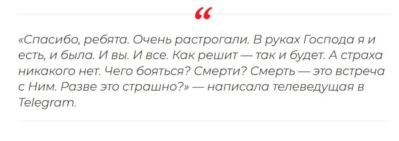 Она благодарит тех, кто выразил поддержку и проявил интерес к ее состоянию. Она приняла свое состояние и уверена, что все в руках Господа. Как он решит, так и будет. Поэтому она уже не боится смерти. Ведь это будет встреча с Ним.
